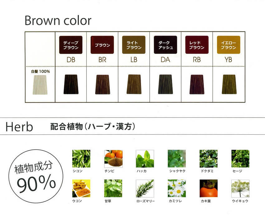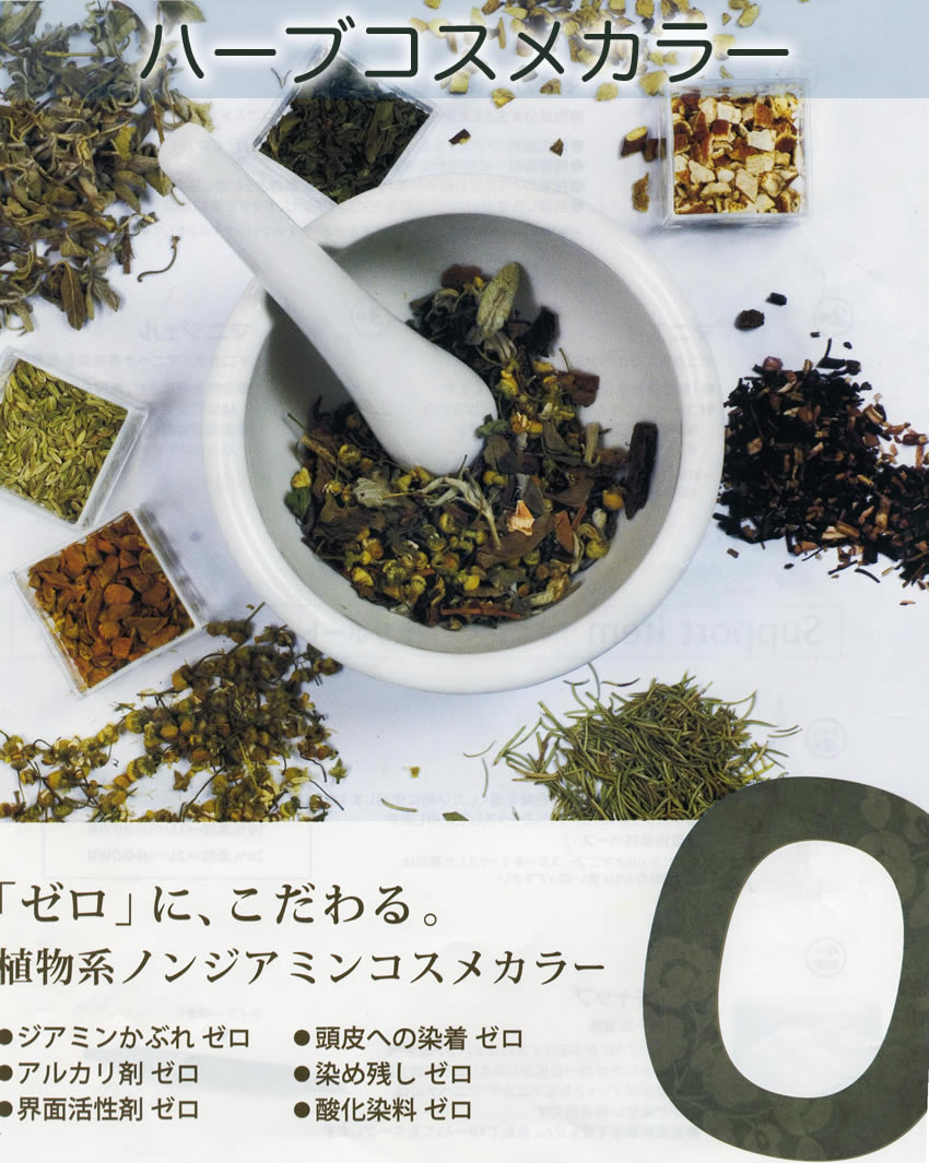 | ハーブコスメカラー 「ゼロ」に、こだわる。 植物系ノンジアミンコスメカラー ・ジアミンかぶれゼロ ・アルカリ剤ゼロ ・酸化染料ゼロ 植物成分 ・シコン・チンピ・ハッカ・シャクヤク・ドクダミ・セージ ・ウコン・甘草・ローズマリー・カミツレ・カキ葉・ウイキョウ |